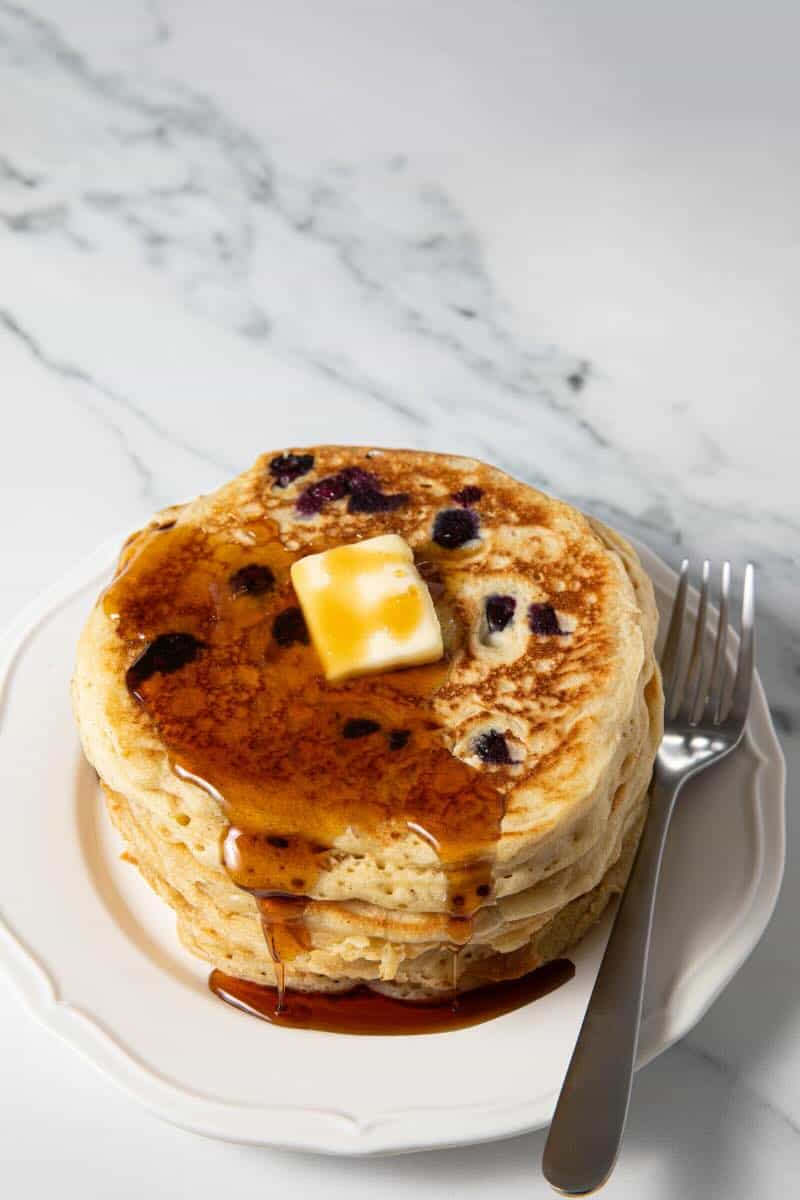 Fluffy pancakes made with gluten-free flour, almond milk, and a drizzle of maple syrup are the perfect gluten-free breakfast option when you want something cozy without relying on gluten-filled mixes.