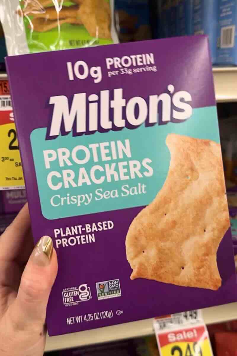 Milton's Protein Crackers (~10g protein per serving): These are the crackers I reach for when I want something crunchy and satisfying without the usual refined ingredients. They've got 10g of plant-based protein per serving from a blend of fava, pea, rice, and sunflower protein and zero grams of added sugar. They hold up beautifully with cheese or dips, or honestly just eaten straight out of the bag. A simple bite that delivers a powerful one-two punch of crunch and nutrition. Shop Milton's Protein Crackers on Amazon