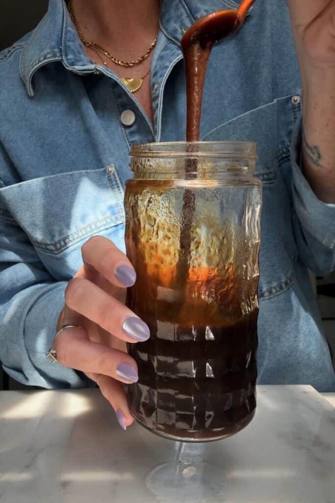 - In a mason jar or shaker, combine the coffee, water, syrup, and a handful of ice.