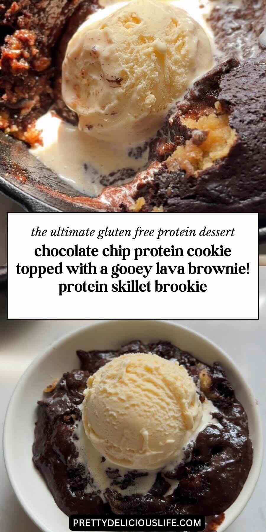 Do not skip the rest time. Even 5 minutes out of the oven makes a difference. The brookie will hold its layers better when scooped and the center will settle into that perfect fudgy texture. Use coffee in the brownie batter if you can. It does not add a coffee flavor, it just makes the chocolate deeper and richer. This is one of those small tweaks that makes a big difference in the final chocolate flavor. Room temperature egg is best. A room temperature egg blends more smoothly into the brownie batter and helps create a more even texture throughout. Pull it out of the fridge when you start gathering your ingredients. Cast iron is the right pan for this. A cast-iron skillet distributes heat evenly throughout the protein brownie skillet and gives you those slightly crisp edges with a soft, gooey center. You can use a standard oven-safe skillet if you do not have cast iron, but the results are best in a cast iron skillet. Do not overbake. The top should look just set and the center should still have a slight jiggle when you pull it. The brookie will continue to cook slightly from residual heat. Overbaking is the fastest way to lose that lava cake texture. Can I make this vegan? You sure can! Swap in your favorite vegan protein powder, a flax egg and follow the package instructions to make vegan skillet brownies for the top layer. Some people use unsweetened applesauce as an egg replacer, but I have not tested that in this recipe.Serving Ideas