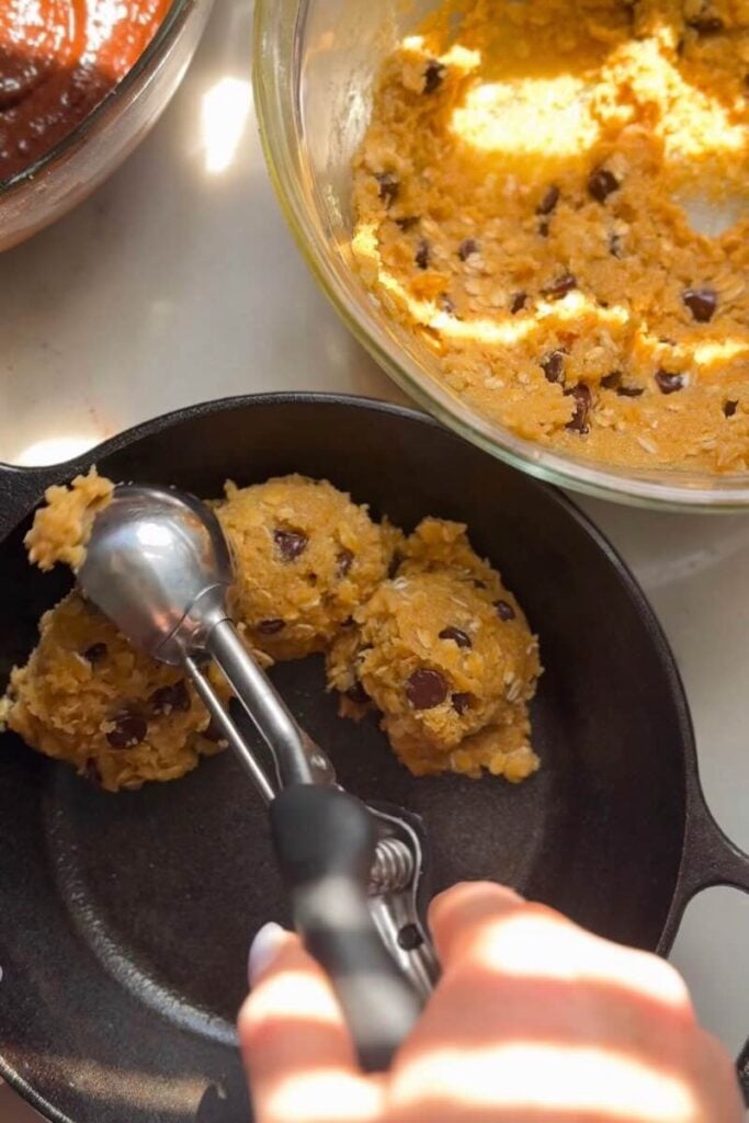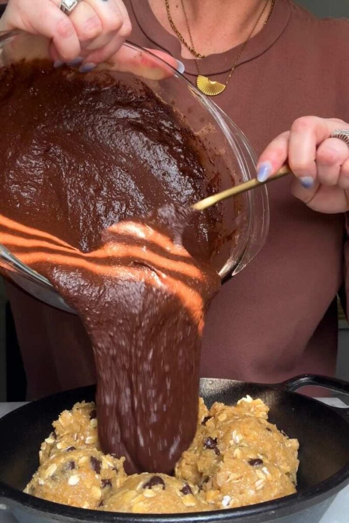 - Layer the skillet. Lightly grease an 8 to 12-inch cast iron skillet. Scoop the cookie dough into the skillet first and spread it into an even layer using the back of a spatula or your hands. Then pour the prepared brownie batter directly on top of the cookie layer.