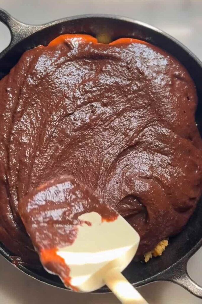 4. Layer the skillet. Lightly grease an 8 to 12-inch cast iron skillet. Scoop the cookie dough into the skillet first and spread it into an even layer using the back of a spatula or your hands. Then pour the prepared brownie batter directly on top of the cookie layer.