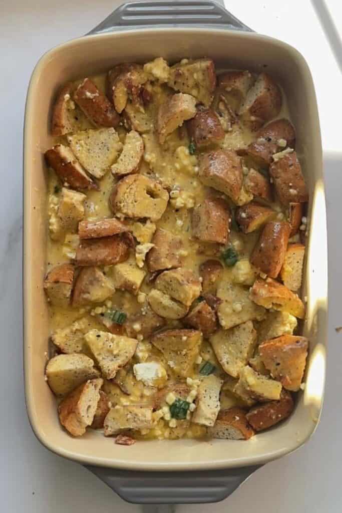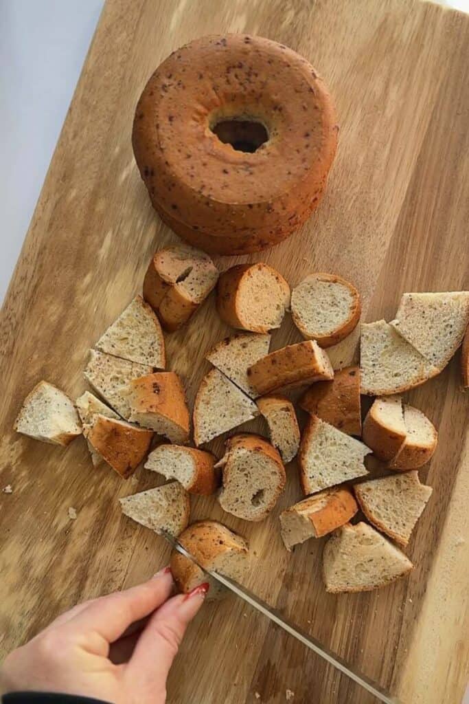 - Cut the bagels into uniform cubes so the egg mixture absorbs evenly.