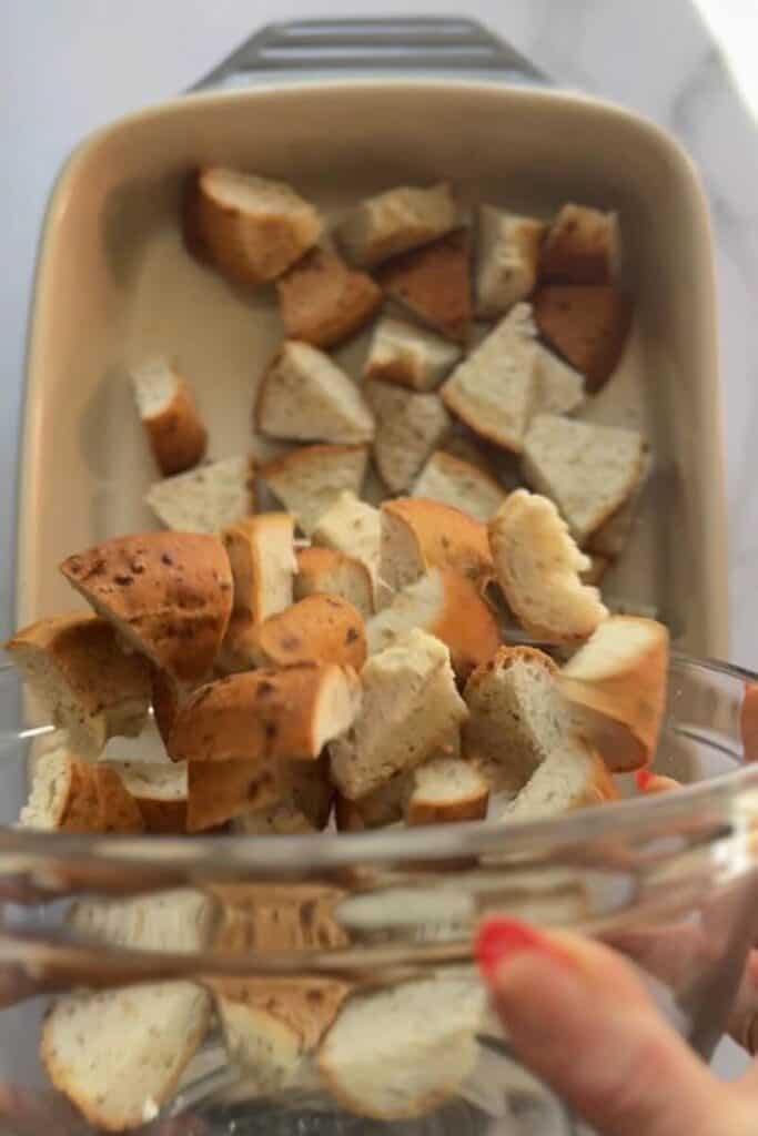 2. Add the bagels. Add the bagel cubes to the dish, spreading them into an even layer.