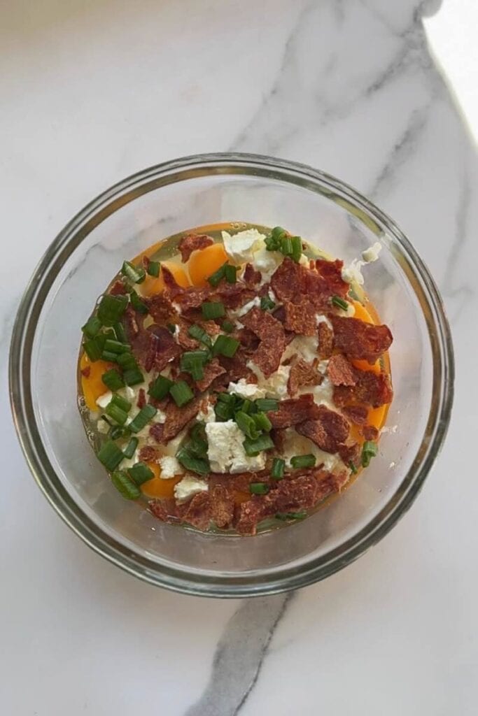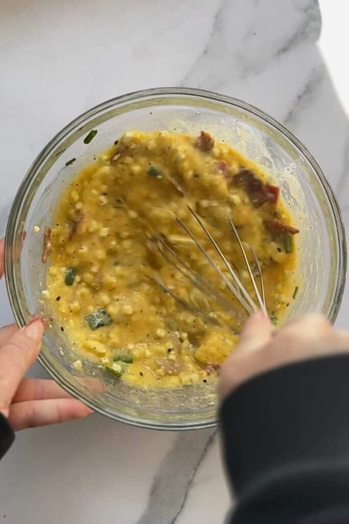 - Whisk the egg mixture. In a large bowl, whisk together the eggs, milk, cottage cheese, feta crumbles, scallions, everything bagel seasoning, kosher salt, and black pepper until smooth.