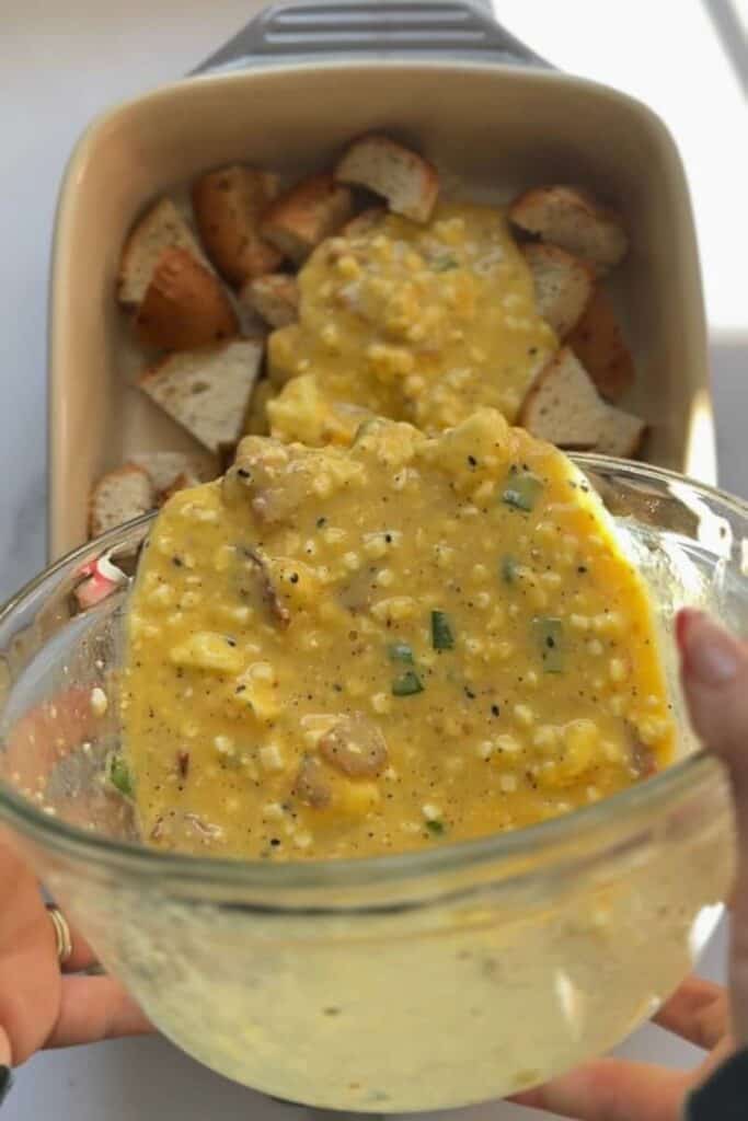 - Pour over the casserole. Slowly pour the egg mixture over the bagel cubes, gently pressing down so everything begins to soak.