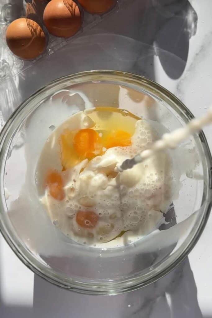 - Mix the custard. In a large bowl, whisk together the whole eggs, egg whites, milk of choice, cottage cheese, melted butter, vanilla extract, cinnamon, brown sugar, and kosher salt until smooth. Tip: blend your cottage cheese up ahead of time if you do not like the texture of curds.
