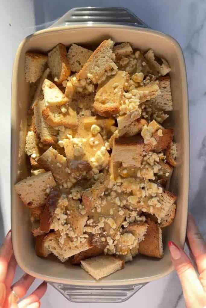 - Add the egg mixture. Pour the custard evenly over the bread so every cube gets a good bread soak.