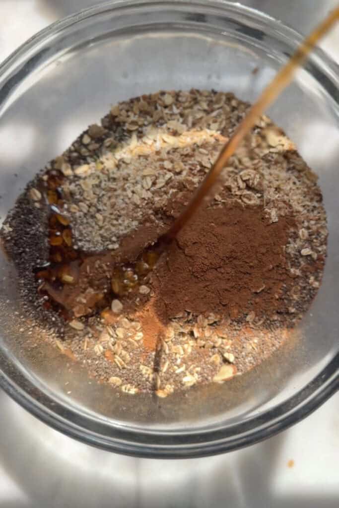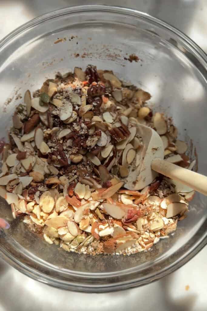 - Mix dry ingredients. In a large mixing bowl, combine nuts, seeds, oats (if using), coconut, chia seeds, pumpkin pie spice, and sea salt.