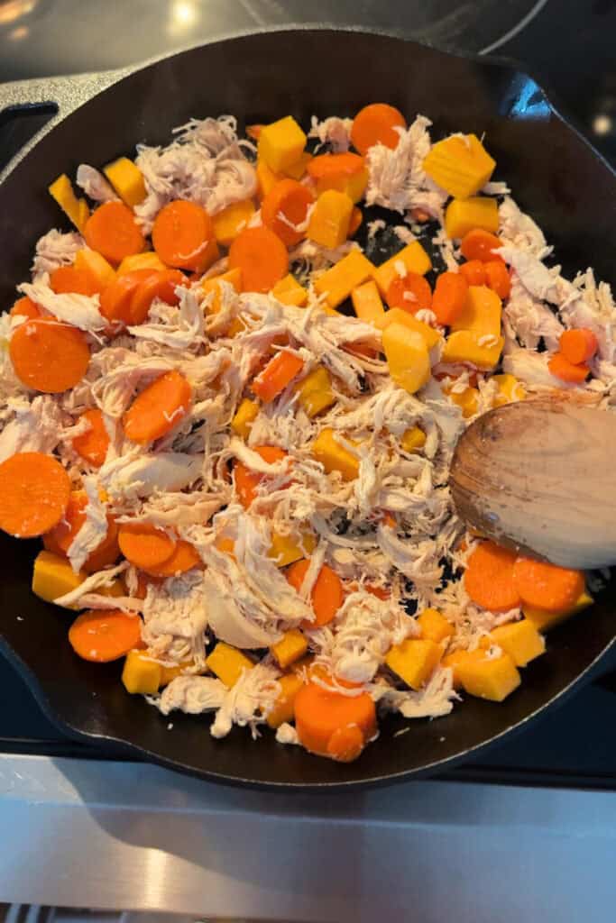 - Sauté the chicken, squash and carrots. In a large oven safe skillet, heat garlic-infused olive oil over medium heat. Add the chicken and carrots, cooking until browned and tender (about 7 minutes).