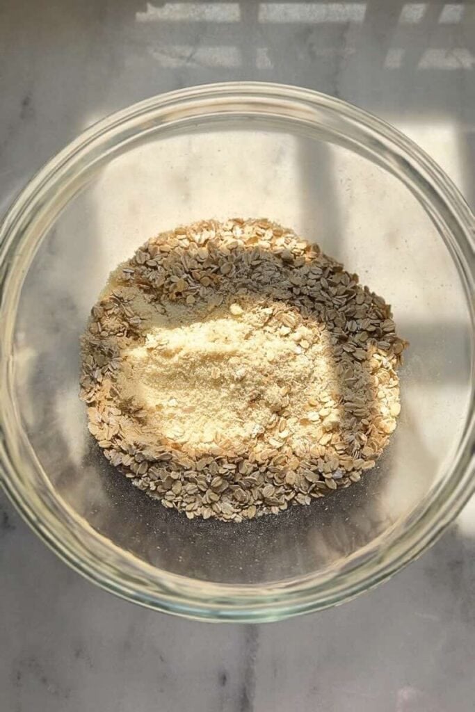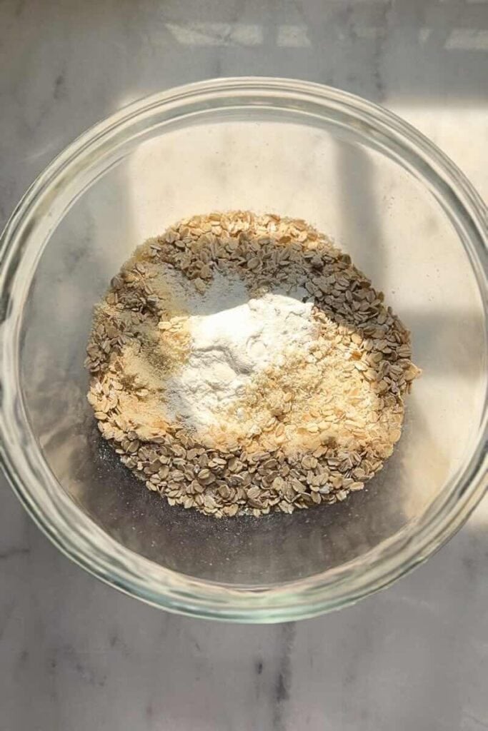 2. Mix the dry ingredients. In a large bowl, stir together the almond flour, protein oats, protein powder, and baking powder.