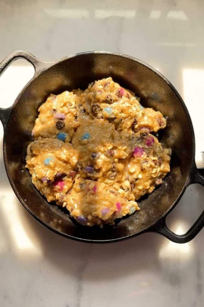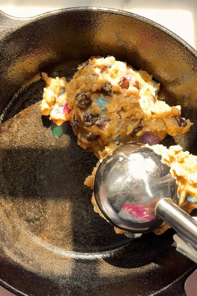 - Scoop the dough using a cookie scoop or ice cream scoop into an 8-inch cast iron skillet in an even layer.
