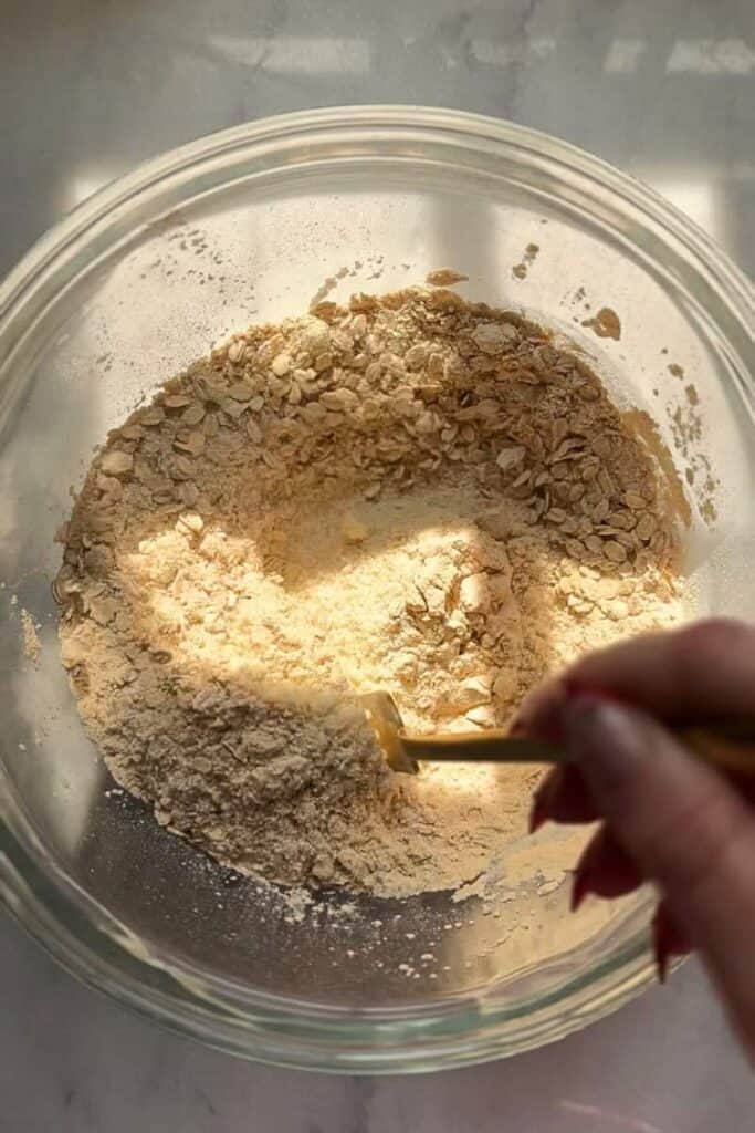 - Mix the dry ingredients. In a large bowl, stir together the almond flour, protein oats, protein powder, and baking powder.