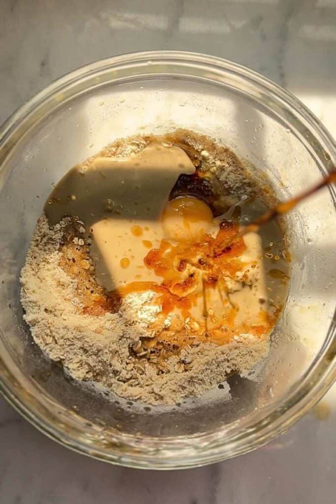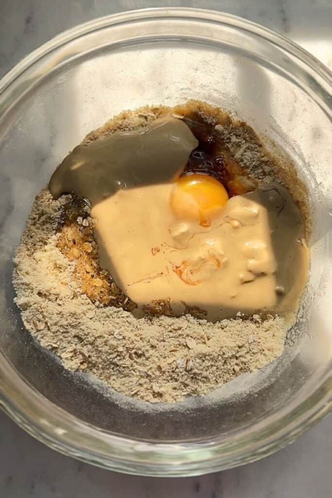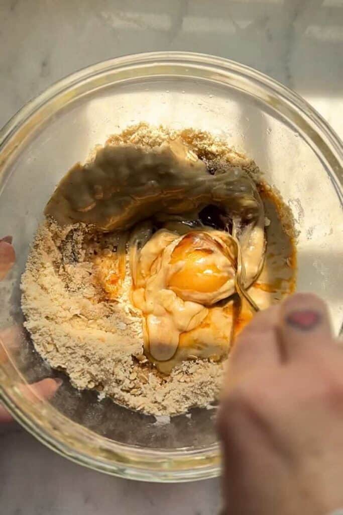 - Mix in the wet ingredients. Add the egg, tahini or sunflower seed butter, maple syrup, and vanilla extract. Mix until a thick cookie dough forms.